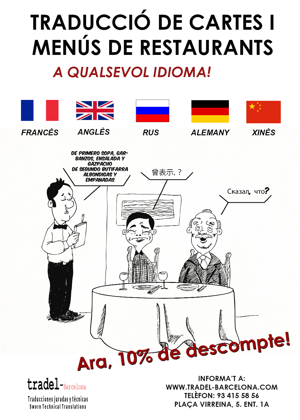 Tradel Barcelona refuerza su campaña en el sector de la restauración con la llegada del verano y ofrece sus traducciones de cartas y menús de restaurantes con un descuento del 10% durante los meses de mayo, junio y julio. Una herramienta muy útil para facilitar el buen servicio a los clientes que llegan de cualquier lugar del mundo con la intención de descubrir nuestra gastronomía. Una inversión que ahorra tiempo a los profesionales del sector y a la vez evita malos entendidos a la hora de escoger la comida que los comensales desean saborear. Como ya hemos aconsejado en otras ocasiones, en esta campaña de verano es muy interesantes que los restaurantes ofrezcan sus menús en idiomas como el chino, el ruso o el japonés ya que cada vez son más los turistas de estos países que nos visitan y para ellos resulta especialmente agradable encontrar la información en sus idiomas de origen.