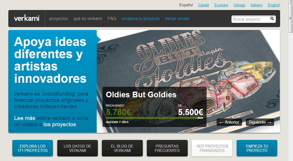 - Madura la idea antes de proponerla. Los proyectos no se cuelgan a la red por decisión propia sino que deben de estar aprobados por el equipo de Verkami, que valorará su viabilidad y la idoneidad con la línea de proyectos a los que suelen apoyar. Dicho esto, la variedad es una de las características de la plataforma, en la que podemos encontrar libros, exposiciones, series de televisión, juegos de mesa, proyectos musicales, etc. Es importante que el texto de la propuesta esté bien escrito y complementado con fotografías y, a poder ser, algún vídeo explicativo. Es muy útil encontrar en el buscador de Verkami proyectos similares al tuyo para plantear qué tipo de recompensas han funcionado bien y así tener un patrón base que puedas aplicar a tu idea.
