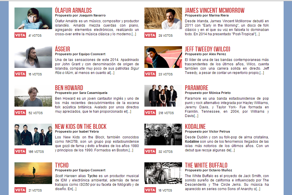 Conciertos por votación popular.Siempre sensibles a las ideas que surgen en internet, hemos descubierto un atractivo proyecto que se ha impulsado desde el pasado otoño bajo el nombre de Cooncert. Se trata de un nuevo concepto para organizar conciertos en directo basándose en los apoyos que una determinada banda recibe en la red. Una propuesta que ya ha cosechado éxito en sus primeras tres ediciones y que ha permitido programar en Barcelona artistas que nunca habían actuado en la ciudad. Y es que con esta fórmula se consigue organizar conciertos que interesan al público, asegurando así el lleno de la sala. De momento, se han celebrado tres ediciones: en el BCN Music Hall, el Sidecar y la Sala 2 del Apolo. Los usuarios de la página web, además de votar, pueden proponer aquellos artistas que deseen ver.