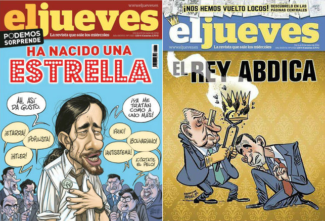 Esta semana, la notícia ha saltado con el cambio a última hora de la portada de ‘El Jueves’, revista que salió un día más tarde a los quioscos debido a la censura de la portada original. De hecho, esta primera página se llegó a imprimir pero después fue eliminada y sustituida por una de muy distinta índole. En la primera se veía al rey Juan Carlos I con la nariz tapada con unas pinzas pasando su corona (recubierta de excrementos) a su hijo, el príncipe Felipe. La portada ya se dio a conocer el mismo lunes a través de internet, después del anuncio oficial de la abdicación. Así que en el momento de la prohibición, la primera página de ‘El Jueves’ ya había llegado a todos los rincones de España vía internet.
