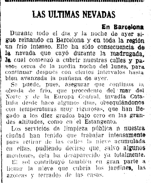 15, 16 y 17 de febrero 1938. En plena Guerra Civil y en un duro momento histórico en el que muchas familias barcelonesas pasaban mucha penuria, cayó durante tres días una de las grandes nevadas de la época provocando problemas logísticos de toto tipo.