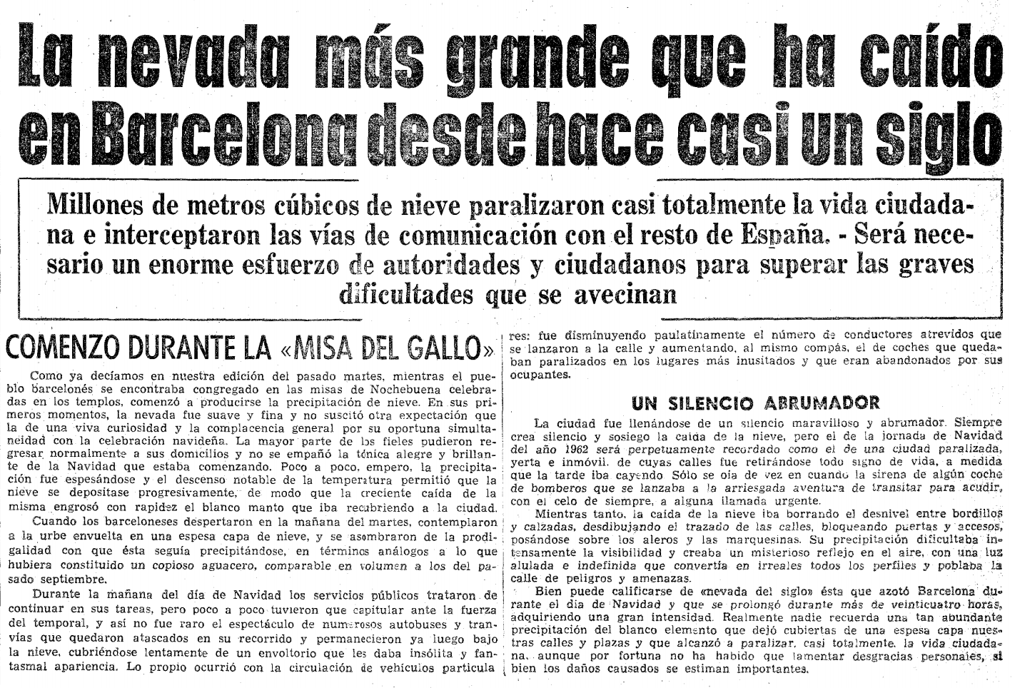 24, 25 y 26 de diciembre 1962. En Nochebuena de 1962 cayó en Barcelona la que es conocida como la nevada del siglo. Empezando a caer copos durante la tradicional Misa del Gallo, la mañana del día de Navidad Barcelona estaba sumergida bajo casi medio metro de nieve, lo cual produjo problemas en los suministros y las azoteas.