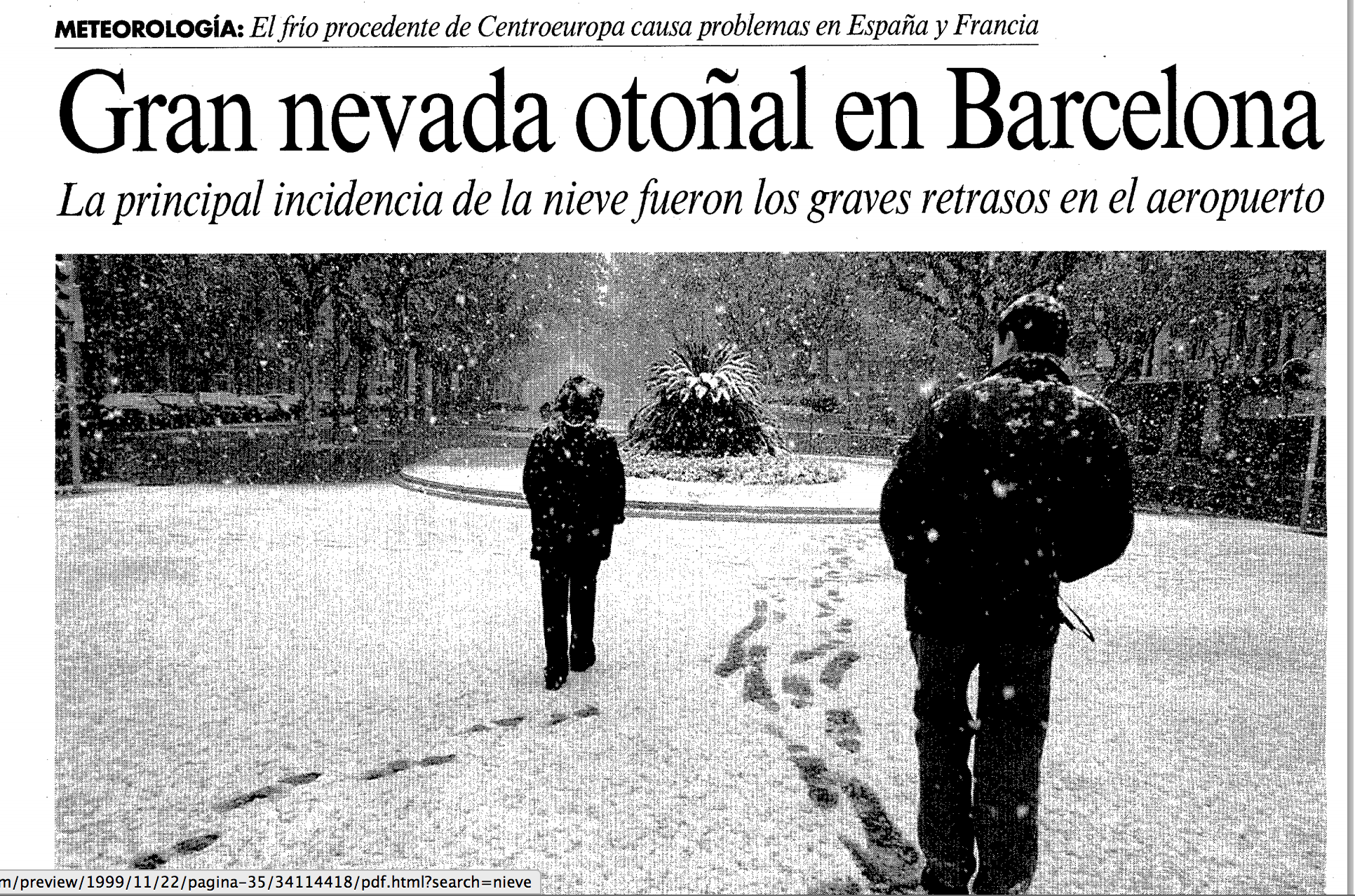 21 de noviembre de 1999. Última nevada del siglo XX y especialmente curiosa si tenemos en cuenta que cayó en pleno otoño. Como cuentan las crónicas, el aeropuerto del Prat fue el principal perjudicado de este inesperado fenómeno que no tenía precedentes documentados hasta la fecha.