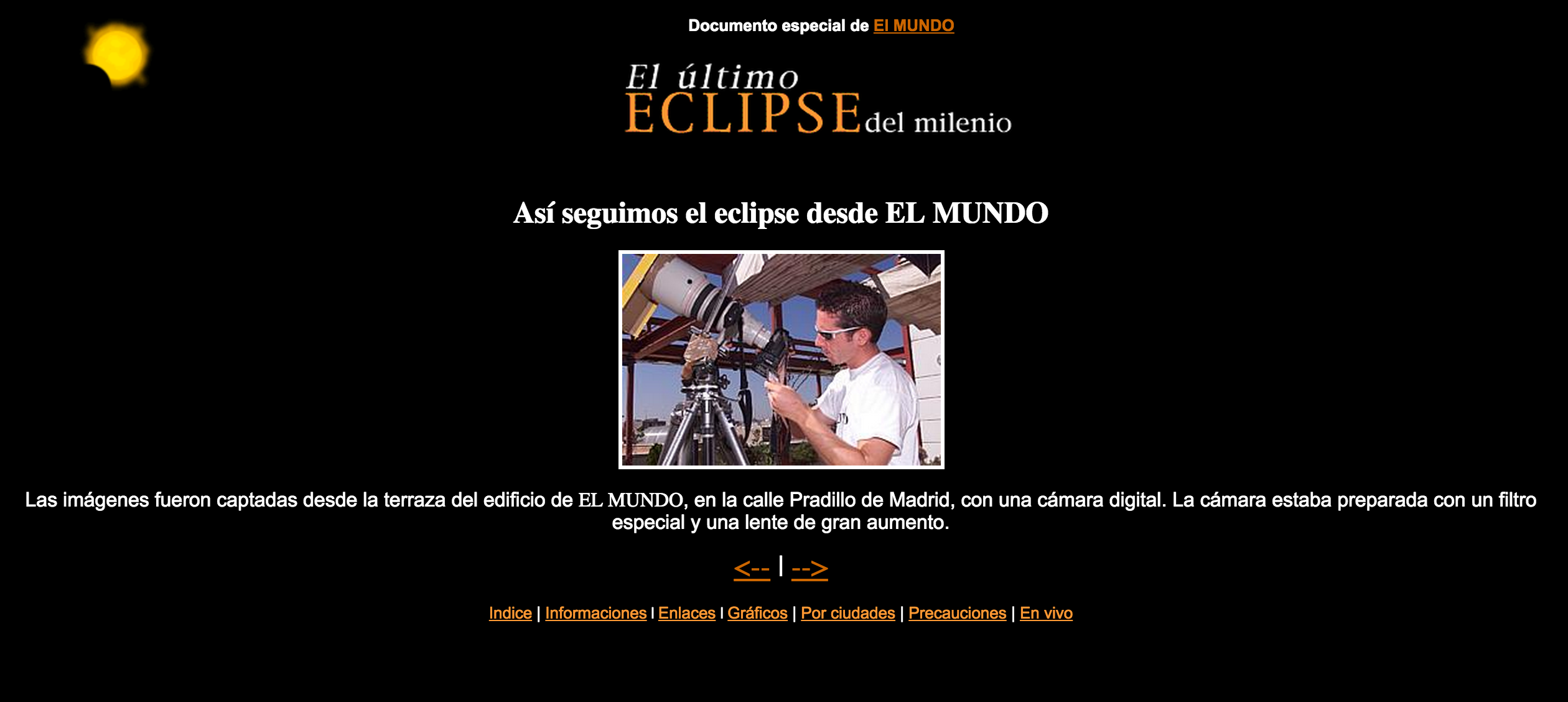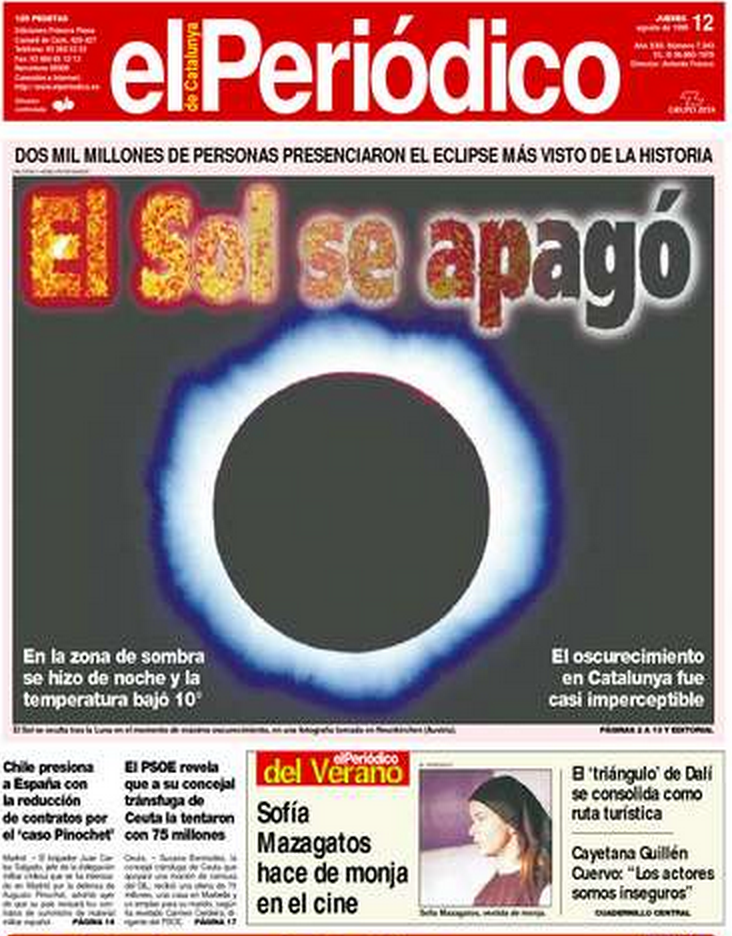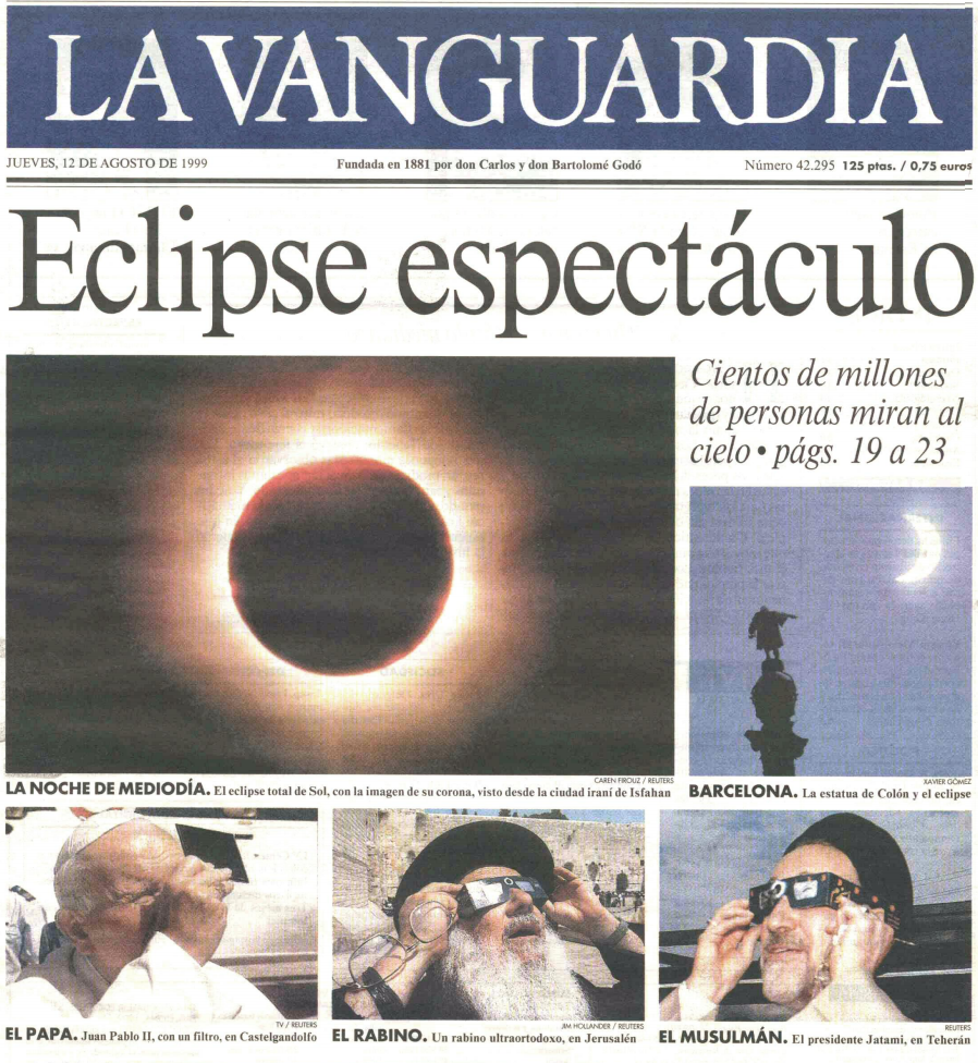En un exercici d’hemeroteca, des del blog de Tradel Barcelona – Traductors Jurats i Tècnics, hem trobat algunes de les notícies que es feien ressó de l’eclipsi de l’11 d’agost de 1999 i que retraten com es va viure el fenòmen a Catalunya i a la resta del món. Així ho van explicar El Periódico de Catalunya, La Vanguardia y El Mundo (diari que va fer un especial a internet que encara es pot consultar i que, a banda del tema que ens ocupa, és una curiosa mostra de com era internet i quin ús en feien els mitjans a finals del segle XX).