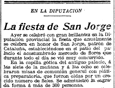 24 de abril de 1915. El diario presenta una crónica de la celebración oficial del día de Sant Jordi que tuvo lugar en el Palacio de la Diputación de Barcelona, en la esquina de la Rambla Catalunya con la avenida Diagonal. En el inicio del artículo ya se documenta la tradición de vender flores en los mercadillos y también queda claro el peso de la tradición católica en la celebración oficial, puesto que son 300 las personas que acuden a la misa celebrada en el mismo Palacio de la Diputación a las ocho de la mañana.