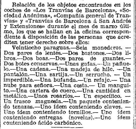 3 de abril de 1915. Hace un siglo, los diarios publicaban textos que hoy en día serían impensables en la prensa actual, puesto que, en la época, eran un canal de información oficial que cubría buena parte de las necesidades de comunicación por parte de las autoridades. De aquí, que a principios de abril de 1915 se publicara la relación de los objetos perdidos en los coches de los tranvías de Barcelona. Destacan 28 paraguas, algunos guantes, gafas, bastones y otros objetos de uso diario, así como elementos menos habituales como un frasco de magnesia o un paquete que contenía ácido carbónico.