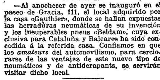 11 de abril de 1915. El paseo de Gracia ya era hace cien años una de las principales vías de la ciudad que, a su vez, representaba la modernidad y la vanguardia catalana. Si hoy en día el comercio de la zona está dedicado especialmente al lujo, con tiendas de moda, joyerías y hoteles de cinco estrellas, por aquel entonces versaba sobre el paseola noticia de la inauguración de una tienda de neumáticos en el número 111 del paseo. El local fue adquirido por la casa Gauthier, que servía, como comenta el artículo, “herraduras neumáticas y los insuperables pneus Beldam”. Una esperada novedad para un sector en auge en ese momento: el automovilismo.