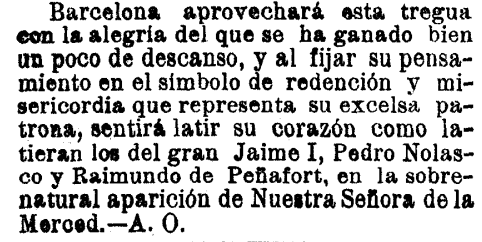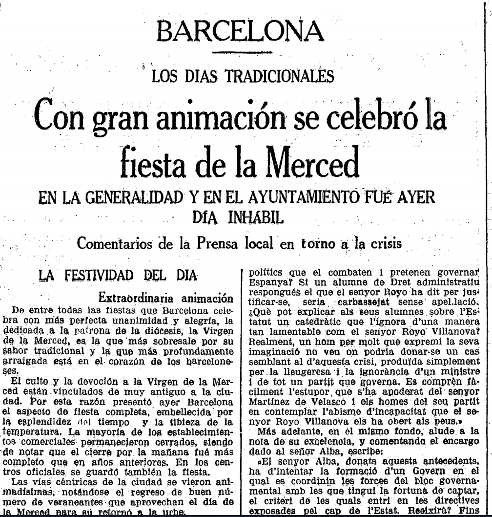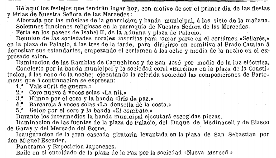 Los lectores asiduos del blog de Tradel Barcelona – Traductores Jurados y Técnicos saben que rebuscar en la hemeroteca es una de nuestras aficiones favoritas. Cada mes editamos un artículo en el que repasamos algunas noticias curiosas que sucedieron en Barcelona justo cien años atrás. Pero, en esta ocasión, queremos celebrar la Fiesta de la Mercè, patrona de Barcelona, con un artículo dedicado a recuperar algunos recortes de prensa que sirven para darse cuenta de cómo ha evolucionado la Festa Major de la capital catalana en los últimos 130 años. Gracias a la hemeroteca online de La Vanguardia (abierta a todos los internautas sin necesidad de ser suscriptor) hemos podido recuperar los escritos referentes a la celebración barcelonesa desde 1881 hasta 2014. Esta fiesta de origen religioso ha vivido distintas etapas a lo largo de la historia reciente de la ciudad. A finales del siglo XIX y hasta mediados del siglo XX, la principal atracción para los vecinos y visitantes era la iluminación nocturna de los edificios públicos, así como los tradicionales actos religiosos.