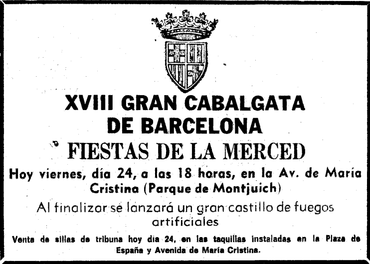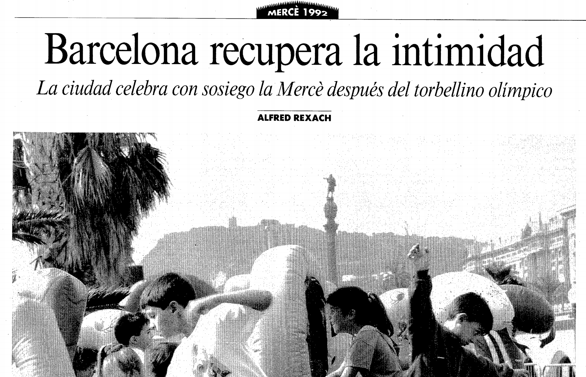 Antes de la Guerra Civil Española era muy habitual organizar eventos deportivos, tales como regatas en el puerto y carreras de atletismo. Hasta hace pocas décadas, los toros también desempeñaban un papel importante en la celebración. Actualmente, ni los toros ni los deportes son los protagonistas de La Mercè. En su programación, destacan las actuaciones musicales y los encuentros de cultura popular catalana, como los castellers, los gigantes o los correfocs. Uno de los grandes espectáculos de La Mercè de hoy en día es el piromusical, que combina una impresionante muestra de fuegos artificiales que estallan al ritmo de la música. Este acto se celebra desde siempre en la avenida Maria Cristina y en la hemeroteca ya encontramos precedentes como el de 1976, en el que se anuncia un “castillo de fuegos” para después de la cabalgata de “las Fiestas de la Merced”. Por otra parte, las crónicas de la primera mitad de siglo centran su atención en la animación que se vivía en el centro histórico de la ciudad, donde se decoraban alguna de sus calles y se vivían con fervor las citas religiosas de la festividad. A continuación, podéis ver algunos de los recortes más destacados del período 1881-2014.