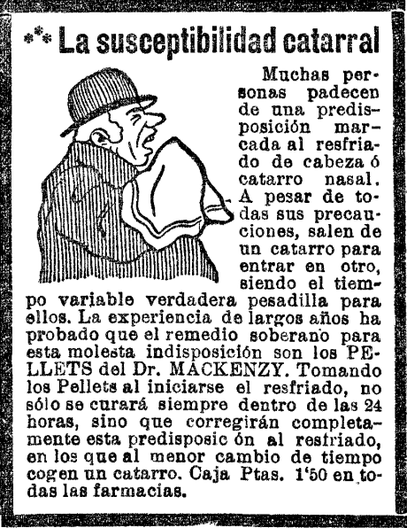 7 de diciembre de 1915. Aunque habitualmente rescatamos noticias, en este caso hemos querido destacar un anuncio que nos da una idea de que las cosas no han cambiado tanto en cien años. Con la llegada del frío del otoño y del invierno, las publicaciones se llenaban de remedios para acabar con los síntomas de los resfriados, como pasa actualmente en los canales de televisión. En este caso en concreto, el anuncio proclamaba las bondades de los Pellets del Dr. Mackenzy, que, según reza el texto, curaba el resfriado en tan sólo 24 horas.