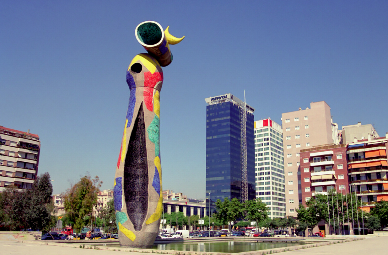 Dona i Ocell (Joan Miró, 1983). Esta escultura está situada en el actual Parc Joan Miró y fue la última obra pública realizada por Miró antes de morir. Debido al gran reconocimiento internacional de este artista barcelonés nacido en 1893, Dona i Ocell (Mujer y pájaro) es una de las obras más destacadas en las guías turísticas. No obstante, cuando se inauguró, se creó un intenso debate en la prensa local a raíz de su forma fálica y su representación parcial de una vagina.