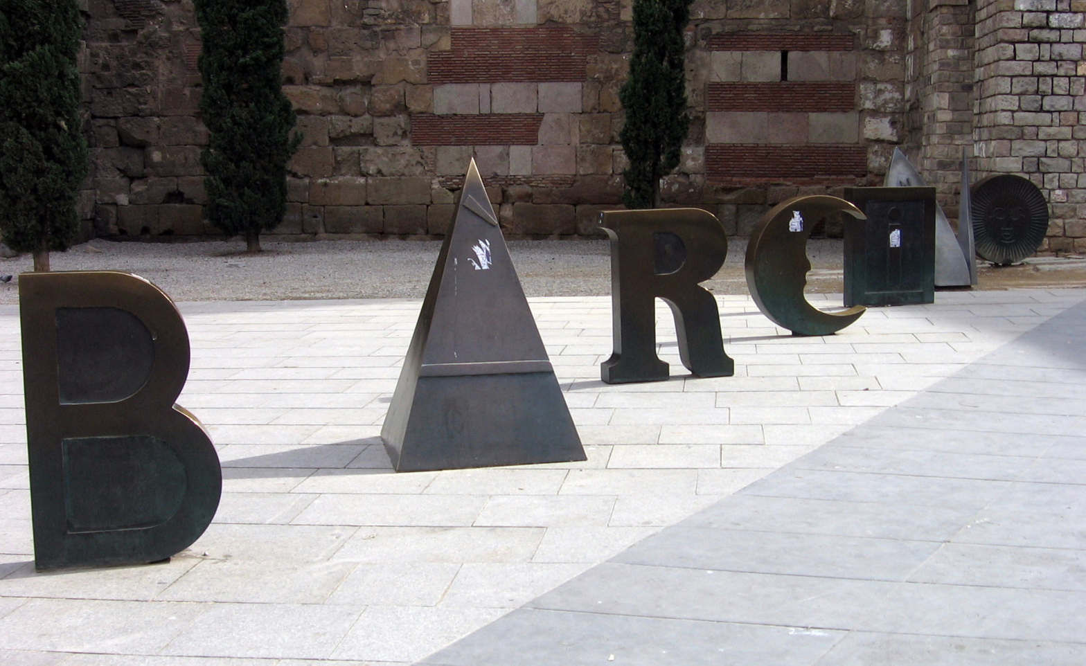Barcino (Joan Brossa, 1992). Barcino es la obra qu el poeta catalán Joan Brossa quiso situar justo enfrente de los restos de la muralla romana que se conservan en el núcleo antiguo de la ciudad, en el barrio Gótico. Barcino era el nombre romano de Barcelona y Brossa hace una representación de estas letras con su particular estilo. La obra fue pensada en 1992, aunque no se instaló a pie de calle hasta 1994. La forman seis letras de bronce y una de aluminio.