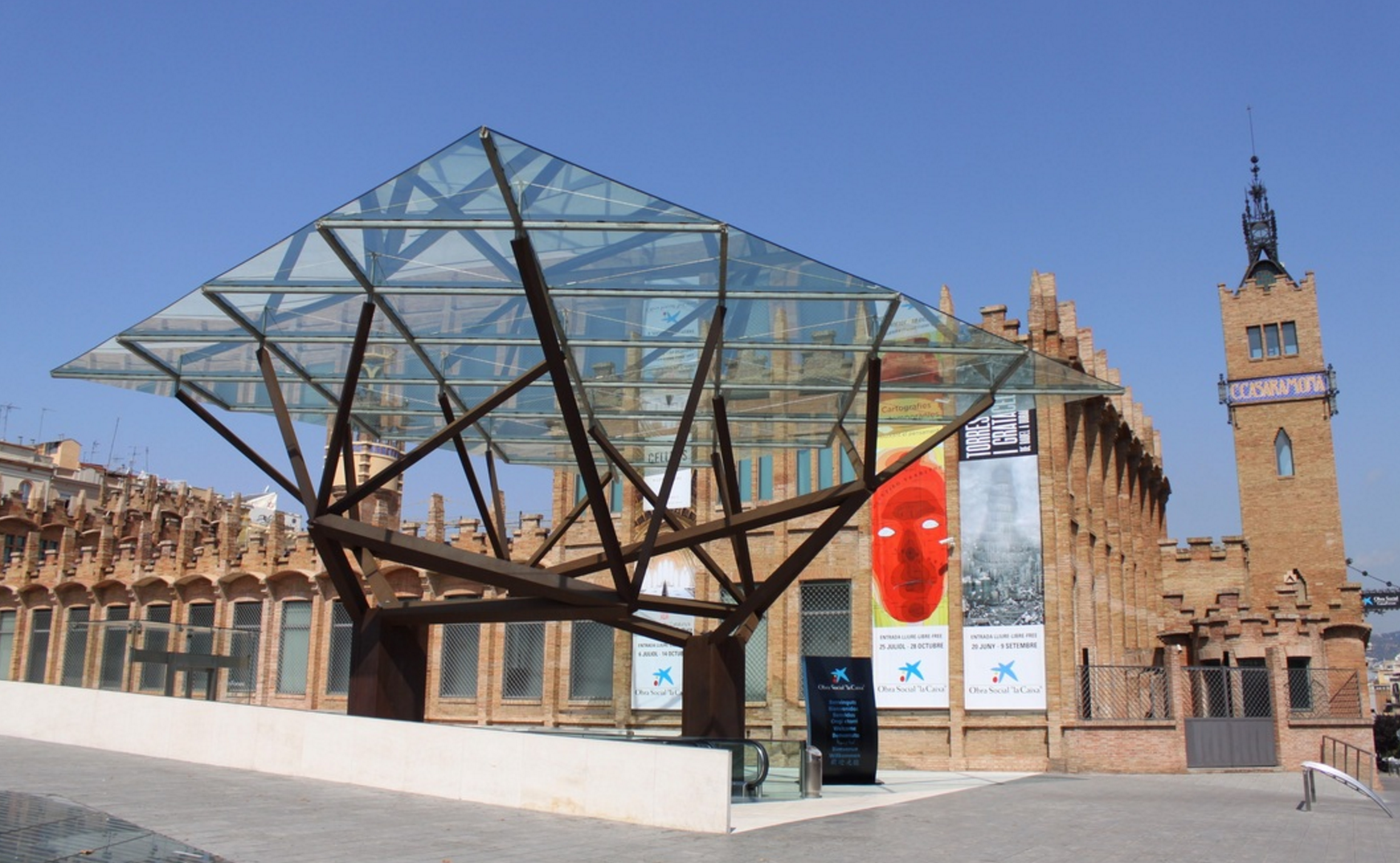 Arbres Bessons (Arata Isozaki, 2001). Con la llegada del siglo XXI se estrenó una nueva obra universal en Barcelona, en este caso, a la entrada del espacio cultural Caixa Forum, que empezaba su andadura por aquel entonces. El trabajo del arquitecto japonés Arata Isozaki representa dos árboles gemelos unidos por las copas, que son de vidrio transparente, ofreciendo aún más luz a un espacio pensado para que la luz solar desempeñe un papel protagonista.