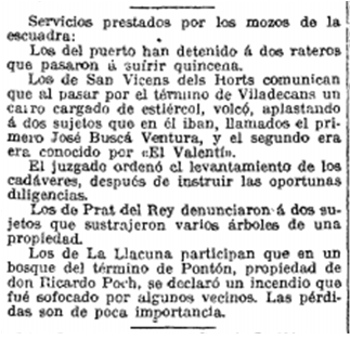 6 de septiembre de 1916. La manera de informar sobre los sucesos y casos policiales ha cambiado a lo largo de la historia. Hace un siglo no existían los canales de comunicación que existen hoy en día y los periodistas solían esperar el parte diario en las comisarías policiales. En este recorte de La Vanguardia del 6 de septiembre de 1916, podemos ver el resumen de la actividad de los actuales Mossos d’Esquadra: