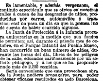 12 de noviembre 1916. Hemos seleccionado esta noticia por el tono de denuncia que expresa el periodista. Como podemos leer, el recorte manifiesta malestar por los accidentes que los coches, tranvías y carros producen en los niños. En este fragmento, vemos como la Junta de Protección a la Infancia daba algunas alternativas para que esto no pasara. Esta institución se fundó en 1908 y estuvo vigente hasta 1985, cuando se aprobó la Ley de Protección de Menores de Catalunya.