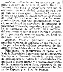 23 de noviembre de 1916. La prensa de este día explica diferentes propuestas del Ayuntamiento que afectarían a la ciudad de Barcelona con el objetivo de que esta se convirtiera en un reclamo turístico. Como vemos, el Ayuntamiento aprobó desde propuestas artísticas, hasta carreras de caballos. Cabe destacar también que al alcalde de entonces se le califica como “alcalde accidental” porque Lluís Duran y Ventoso vivió la crisis de gobierno de 1916 provocado por la huelga general y regresó más tarde al Ayuntamiento.