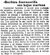 30 noviembre de 1916. Como cada mes, nos gusta también fijarnos en un anuncio publicado hace 100 años para descubrir las modas de entonces. En este caso, hemos seleccionado un recorte que recomienda tomar hojas marinas para adelgazar y cuidar el cutis. Parece que los ideales de belleza empezaban a parecerse a los de hoy.