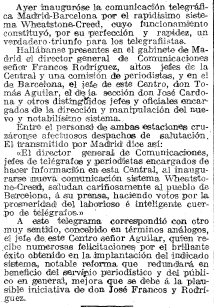 11 de febrero de 1917. En este recorte leemos cómo se instaló el telégrafo entre Madrid y Barcelona, un gran avance en el sistema de telecomunicaciones de antaño. Para inaugurarlo, utilizaron un sistema eléctrico que nació en Inglaterra y que no sólo dio un paso más en las comunicaciones, también fue un gran avance para el transporte del ferrocarril.