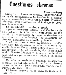 18 de febrero de 1917. Los episodios de huelga empezaban a ser tan recurrentes que algunos medios de comunicación, como este recorte de La Vanguardia, inauguraron una sección específica para informar de estas noticias laborales. Aquí podemos leer como se sucedían las quejas en sectores como el metalúrgico, el textil o la albañilería.