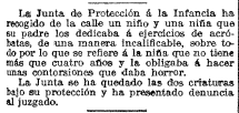 27 de febrero de 1917. Hemos seleccionado este recorte por el tono de denuncia del periodista. Como podemos leer, la Junta de Protección de la Infancia recogió de la calle a dos niños que realizaban trabajos acrobáticos con su padre para recoger dinero. Esta institución de protección al menor se creó en 1908 y estuvo vigente hasta 1985, cuando se aprueba la Ley de Protección de Menores de Catalunya.