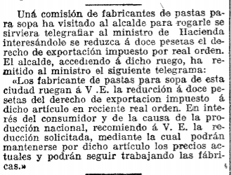 1 de septiembre de 1917. La primera noticia de esta hemeroteca nos demuestra como los comerciantes ya se organizaban por gremios: en este caso, curioso, se agruparon los fabricantes de pastas para sopas para pedirle al alcalde que se redujera el precio de exportación de su producto. El alcalde de aquel entonces era Lluís Duran y Ventosa, que ocupó este cargo de julio a diciembre de 1917.