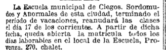 14 de septiembre de 1917. Esta noticia nos demuestra como Barcelona ya trabajaba entonces en programas de formación para personas con discapacidad (aunque el nombre de la escuela no fuera el más apropiado). En 1820 se abrió la Escuela Municipal de Ciegos, en 1843 se abrió la Escuela Municipal de Sordomudos, en 1856 se fusionaron y en 1910 incorporó a niños con discapacidades psíquicas. Las asignaturas se basaban, sobre todo, en materias artísticas, como música, solfeo o dibujo. Más adelante, se volvieron a dividir y diferentes entidades privadas abrieron nuevos centros en la ciudad.