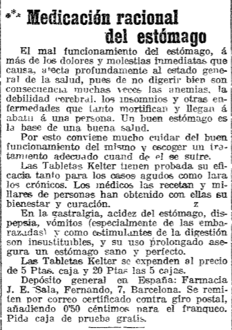 30 de septiembre de 1917. Además de las noticias, en la sección de hemeroteca de Tradel-Barcelona nos gusta fijarnos en la publicidad que por aquel entonces se publicaba en la prensa, una buena forma también de analizar la sociedad y la ciudad de hace 100 años. En este anuncio encubierto en forma de noticia podemos ver cómo se recomienda la ingesta de un medicamento que hoy en día ya no existe, para curar dolores y molestias del estómago. Un dato curioso: como vemos en el último párrafo, ya se hacían envíos a domicilio.