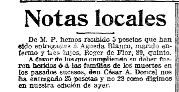 6 de septiembre de 1917. La huelga general del verano de 1917 vivió duros enfrentamientos en las calles de la ciudad con algunos choques violentos entre trabajadores y el ejército. Cuando las autoridades controlaron la huelga, algunos particulares hicieron donaciones, como podemos ver en este recorte, para ayudar a los damnificados y heridos.