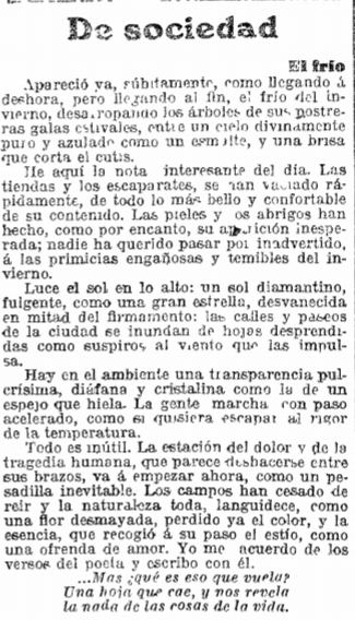 16 de octubre de 1917. Hemos seleccionado este fragmento porque nos llama la atención la forma tan poética que tiene el periodista de anunciar el cambio de estación. Como podemos ver, se describen los cambios que el frío produce en la vida callejera, en las tiendas y en los comercios así como en el ambiente de la ciudad en general. Por si fuera poco, se ayuda de la poesía, de unos versos de Ramón de Campoamor, una herramienta muy curiosa para decir adiós al verano y recibir al otoño.