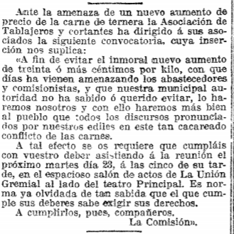 22 de octubre de 1917. Como hemos visto en hemerotecas anteriores, Barcelona era ya una ciudad muy importante en cuanto a comercio e industria, y la organización de sus gremios era uno de los puntos fuertes de sus trabajadores, sobre todo, cuando necesitaban solucionar problemas. Como vemos en esta noticia, se estaba produciendo la amenaza de un nuevo aumento en el precio de la carne, por lo que la comisión de organización les animaba a asistir a una reunión para tratar el asunto. El problema de los precios de la carne llevaba meses atormentando a los vendedores, dado que los abastecedores imponían precios más altos y esto terminaba afectando al precio final que pagaba el consumidor.