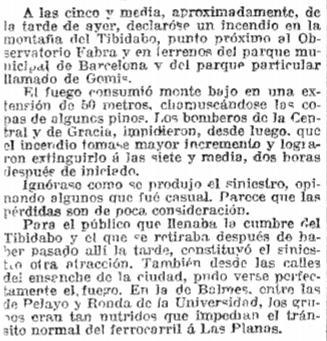8 de octubre de 1917. Los diarios de hace un siglo eran el mejor lugar para consultar los sucesos que ocurrían en la ciudad. En este recorte, vemos cómo el 7 de octubre de 1917 se produjo un incendio sin incidentes graves en la montaña del Tibidabo, tal y como informa el diario del día después. Como podemos leer, algunas de las estructuras e instituciones que hoy en día son un referente en nuestra ciudad, ya funcionaban hace 100 años, por ejemplo: el Observatorio Fabra de la montaña del Tibidabo, el cuerpo de bomberos y los ferrocarriles.