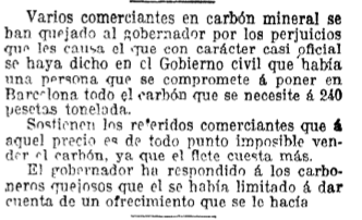 12 de diciembre de 1917. Como hemos visto a lo largo de las diferentes hemerotecas, 1917 fue un año de fuertes reivindicaciones laborales a lo largo de todo el país, muchas de ellas con inicio en Barcelona. Muchos sectores obreros empezaban a sentir conciencia de clase y a protestar por las condiciones laborales, estas protestas se materializarían posteriormente en las huelgas generales de 1918 y 1919, donde se conseguiría mejorar esascondiciones. Hemos visto cómo en Barcelona había, sobre todo, fuertes reivindicaciones en el sector textil, pero en esta noticia vemos otro ejemplo de cómo afectaba a los trabajadores del carbón.