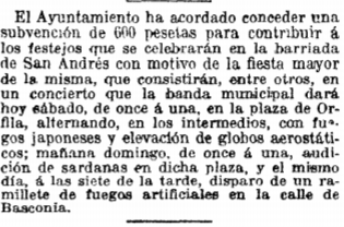 1 de diciembre de 1917. Como podemos ver en este recorte, las fiestas del barrio de Sant Andreu ya se celebraban en un periodo similar al actual (finales de noviembre – principios de diciembre) con actividades muy similares a las que los vecinos organizan un siglo después. Es curioso, no obstante, el presupuesto que otorgaba el Ayuntamiento, impensable hoy en día: 600 pesetas.