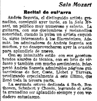 31 de diciembre 1917. Barcelona despedía el año con una agenda repleta de actividades y mostrando que ya era una ciudad que daba cita a grandes artistas. Como vemos en esta noticia, el considerado padre del movimiento moderno de la guitarra clásica, Andrés Segovia, ofrecía un magnífico concierto en la ya desaparecida Sala Mozart. Esta Sala estaba situada muy cerca de La Rambla y durante el siglo XX fue uno de los epicentros de la ciudad en cuanto a espectáculos se refiere.